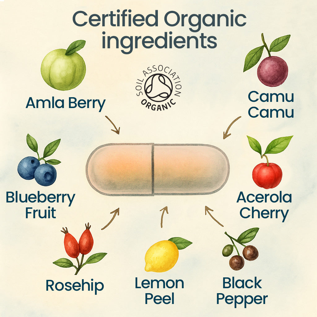 Amla Berry Extract*, Acerola Fruit Extract*, Blueberry Fruit*, Camu Camu*, Lemon Peel*, Rose Hip*, Black Pepper*, Vegetable Capsule (HPMC). *Certified Organic